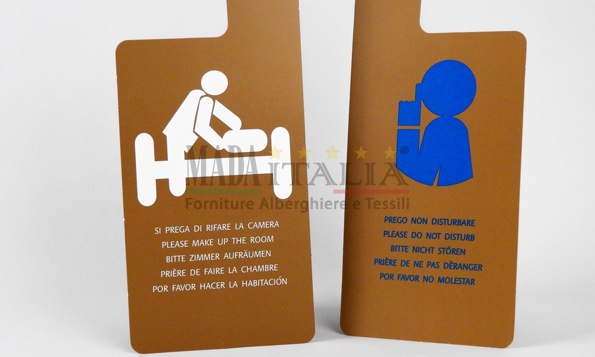 Cartelli per Hotel da appendere sulla maniglia della porta della camera con dicitura, in un lato “Non disturbare”, nell’altro “Si prega di rifare la camera”.