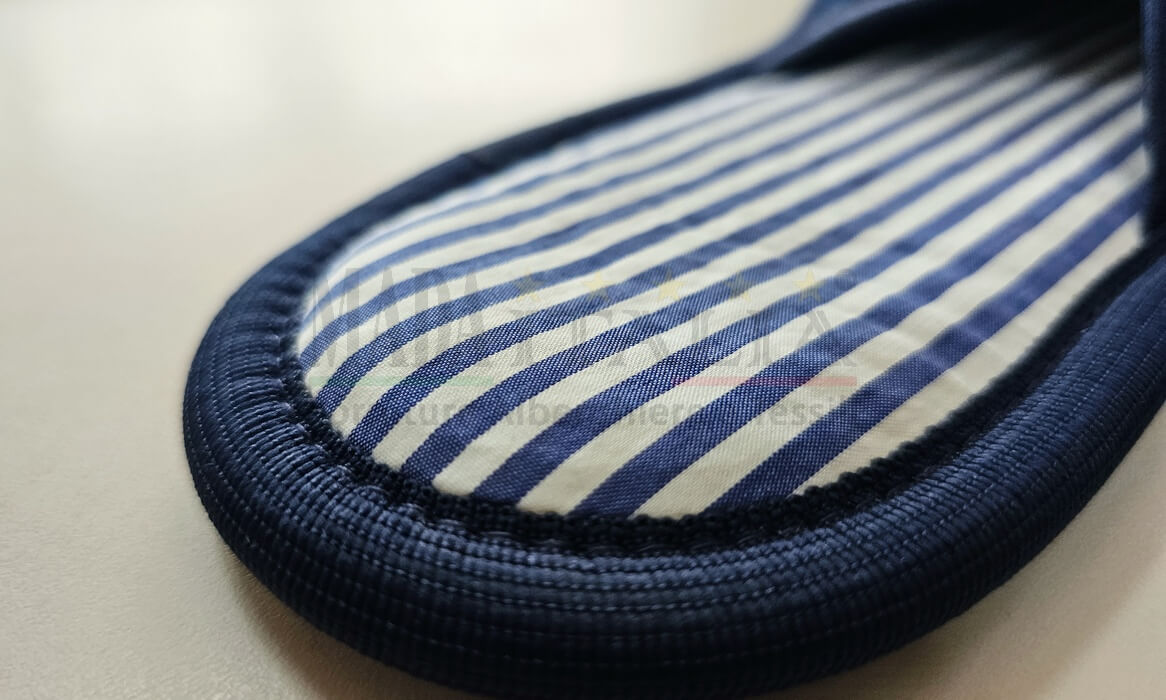 Ciabattine usa e getta professionali in ciniglia blu scuro con soletta a righe e suola in EVA 5 mm.