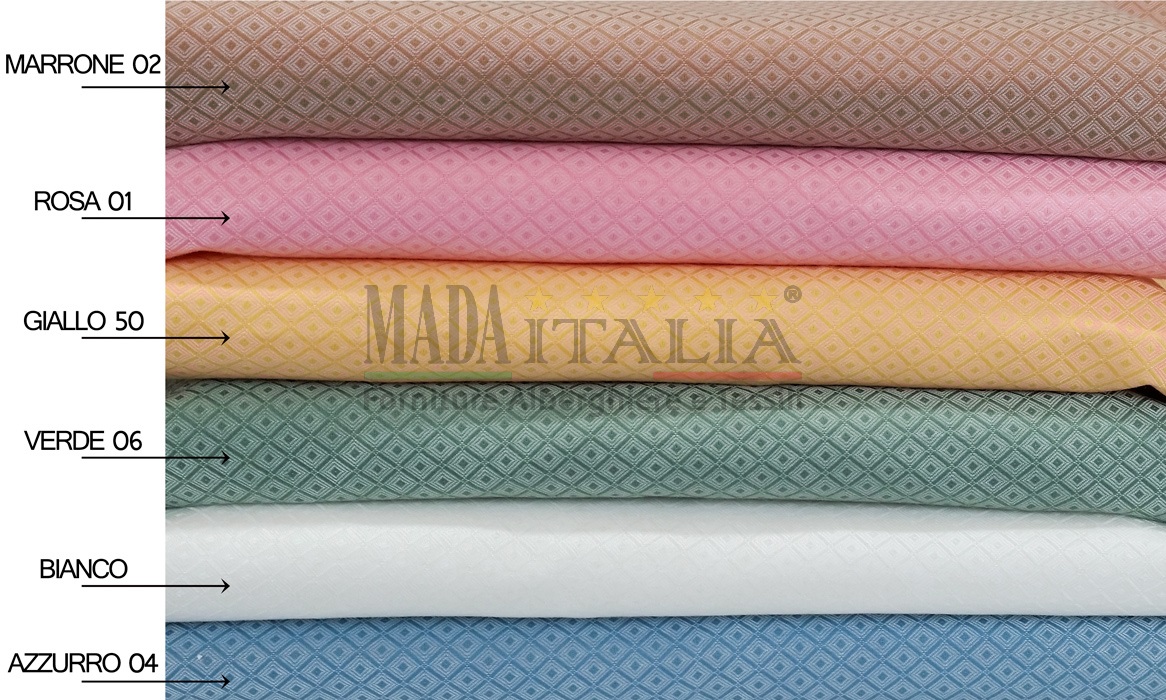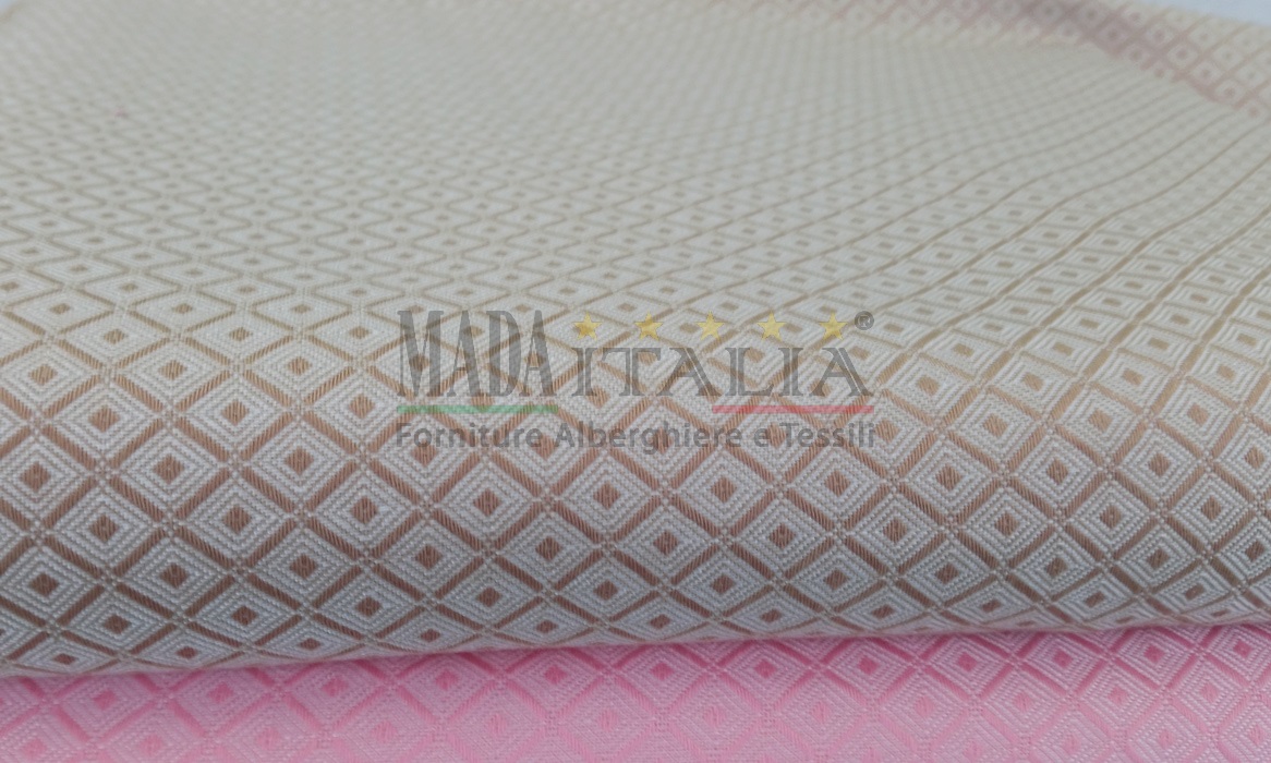 Copriletto ignifugo con classico disegno a rombino, in varie colorazioni tutte tinte in filo indanthrene, adatti a lavaggi industriali.