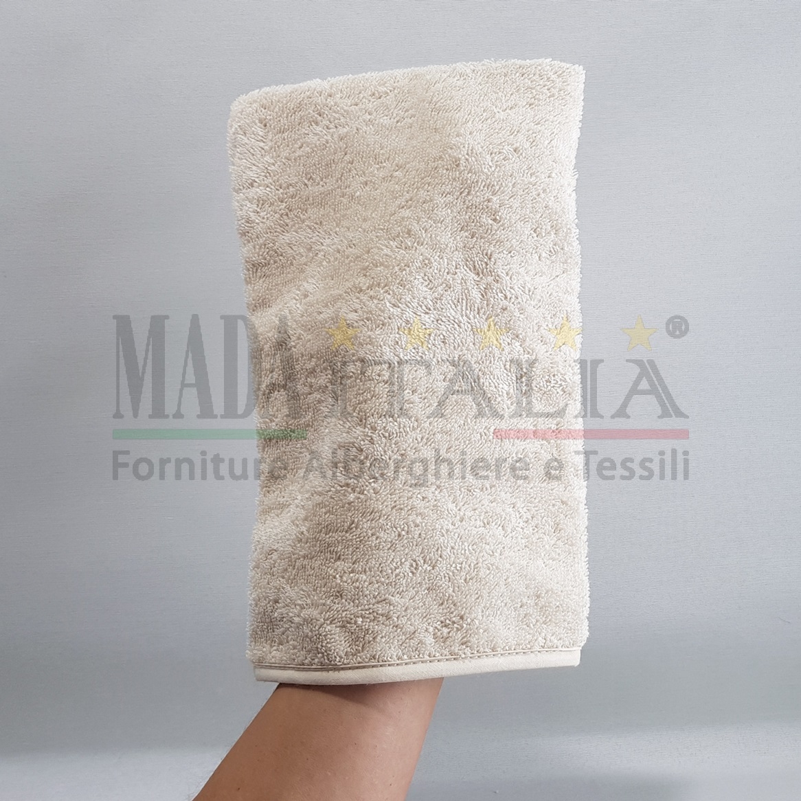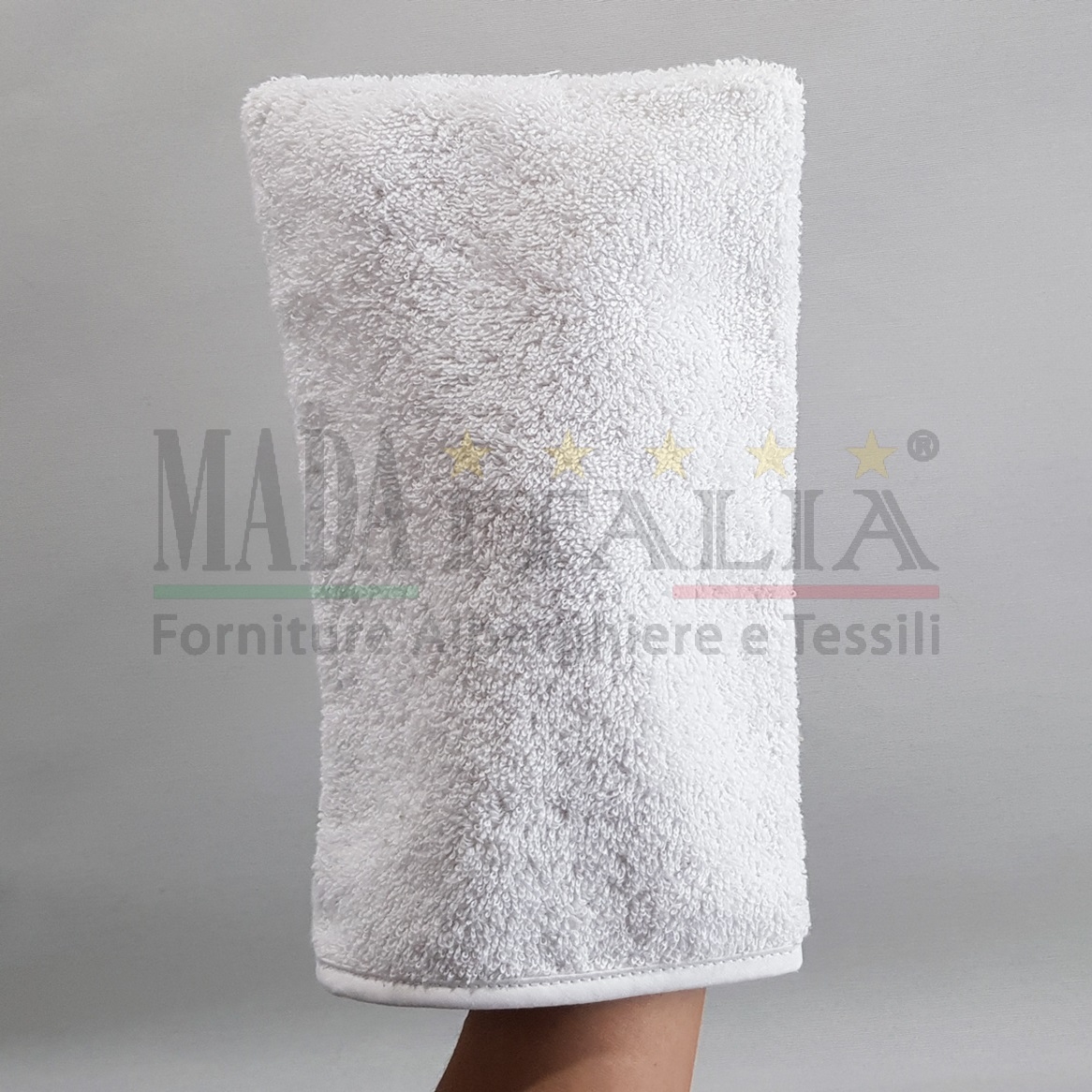 Rifinite con nastro a sbieco in testa in cotone, in tinta con il colore della spugna. La sua composizione lo rende estremamente morbido e delicato sulla pelle. La manopola bianca è resistente a candeggio, mentre per i colorati viene sconsigliato in quanto la spugna è candeggiabile ma il nastro in cotone utilizzato per le rifiniture non è candeggiabile e potrebbe scolorire.