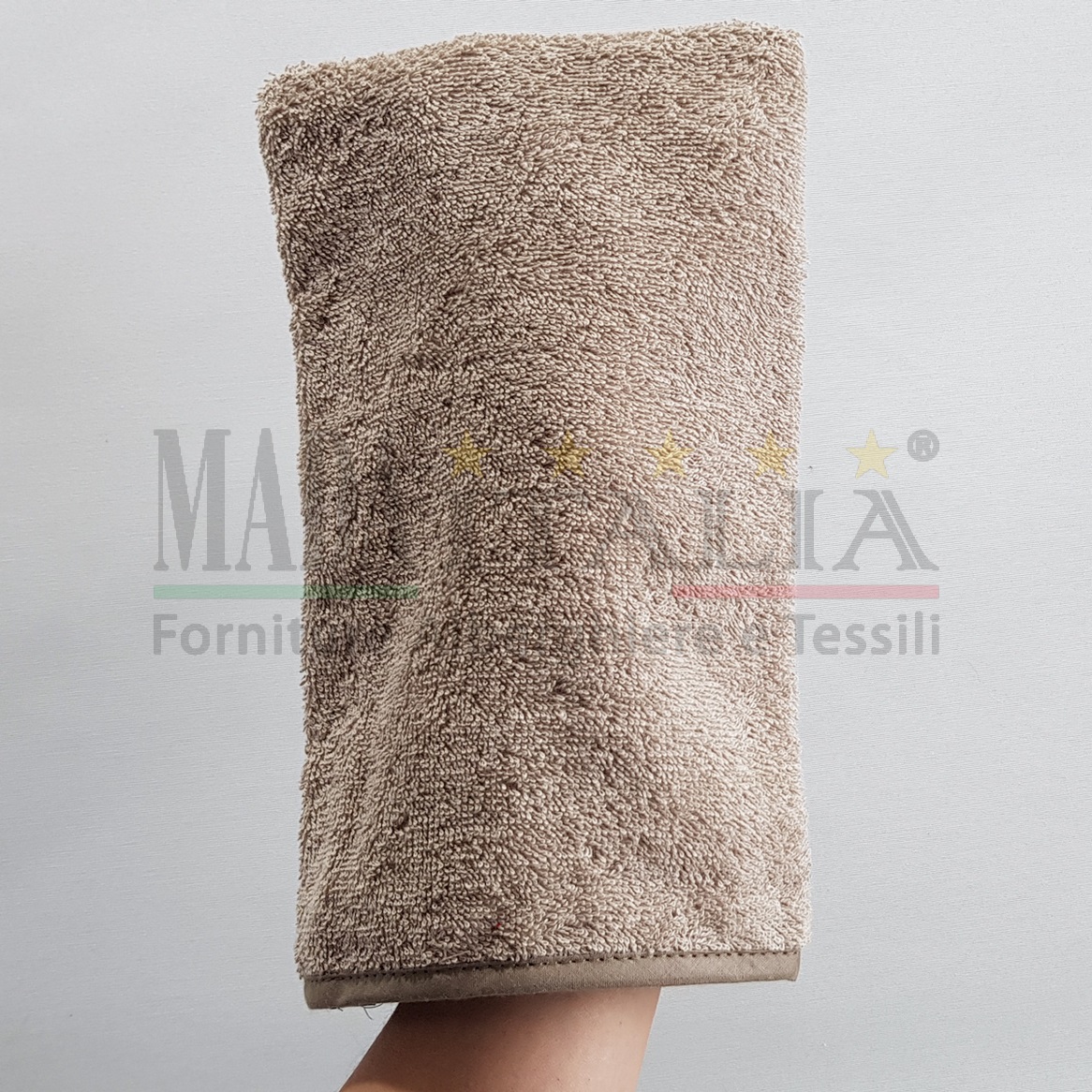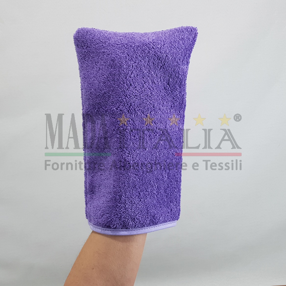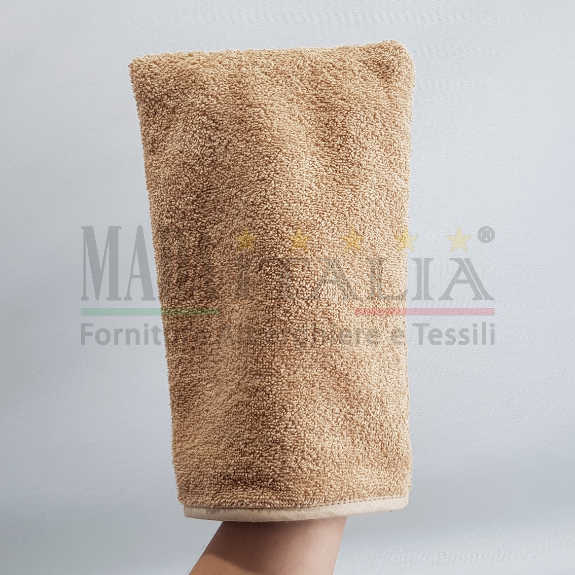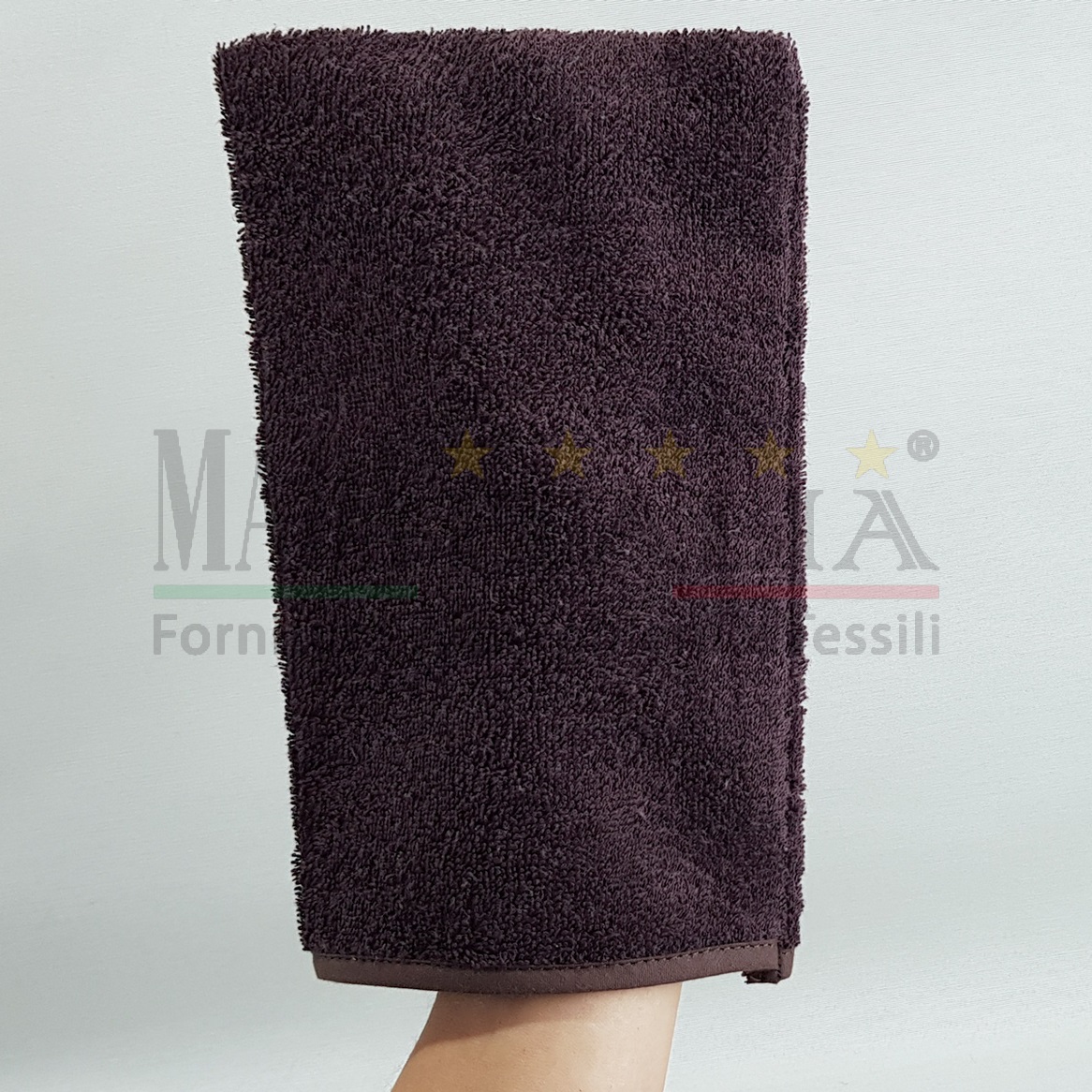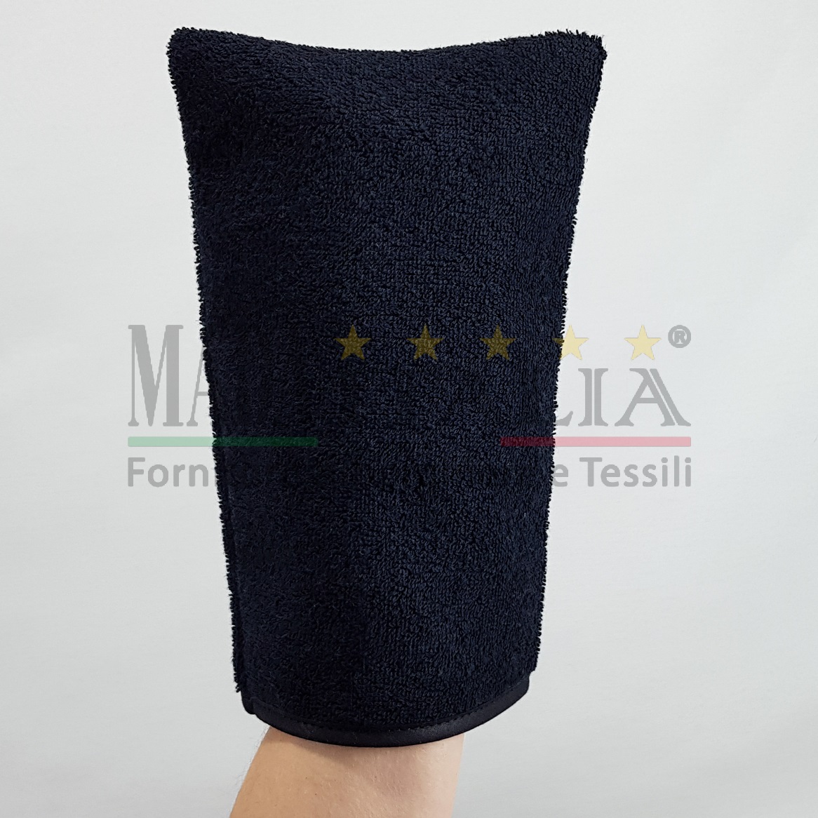 Manopola guanto in spugna realizzato in 100% cotone idrofilo, tinto in varie colorazioni resistenti al candeggio. Cuciture e colori resistenti ai lavaggi intensi.