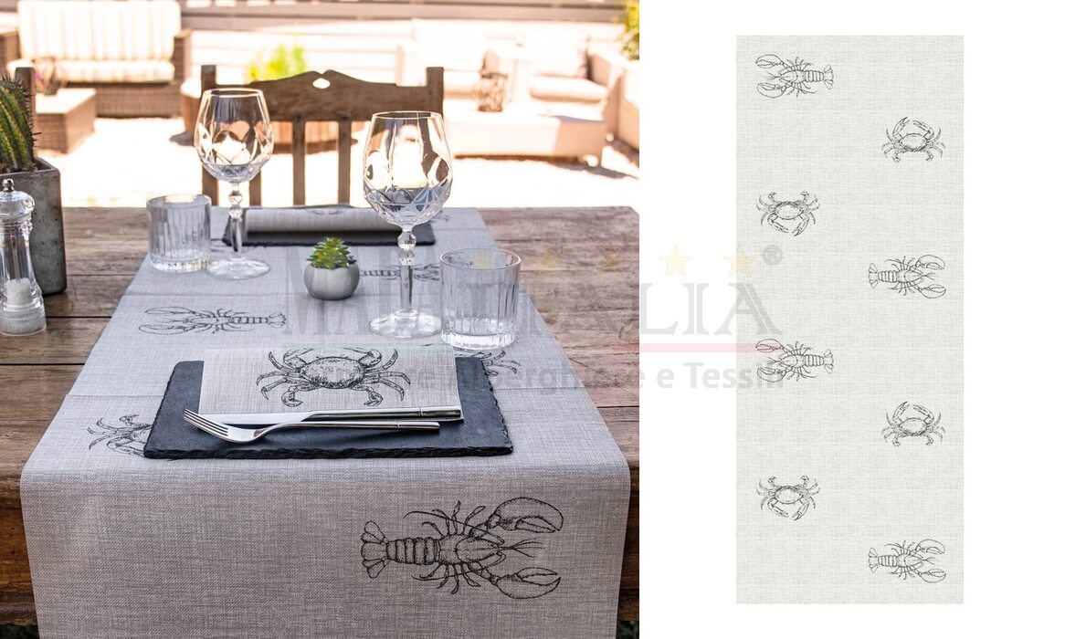 La collezione comprende tovaglie, tovaglioli 44×44, runner realizzati in