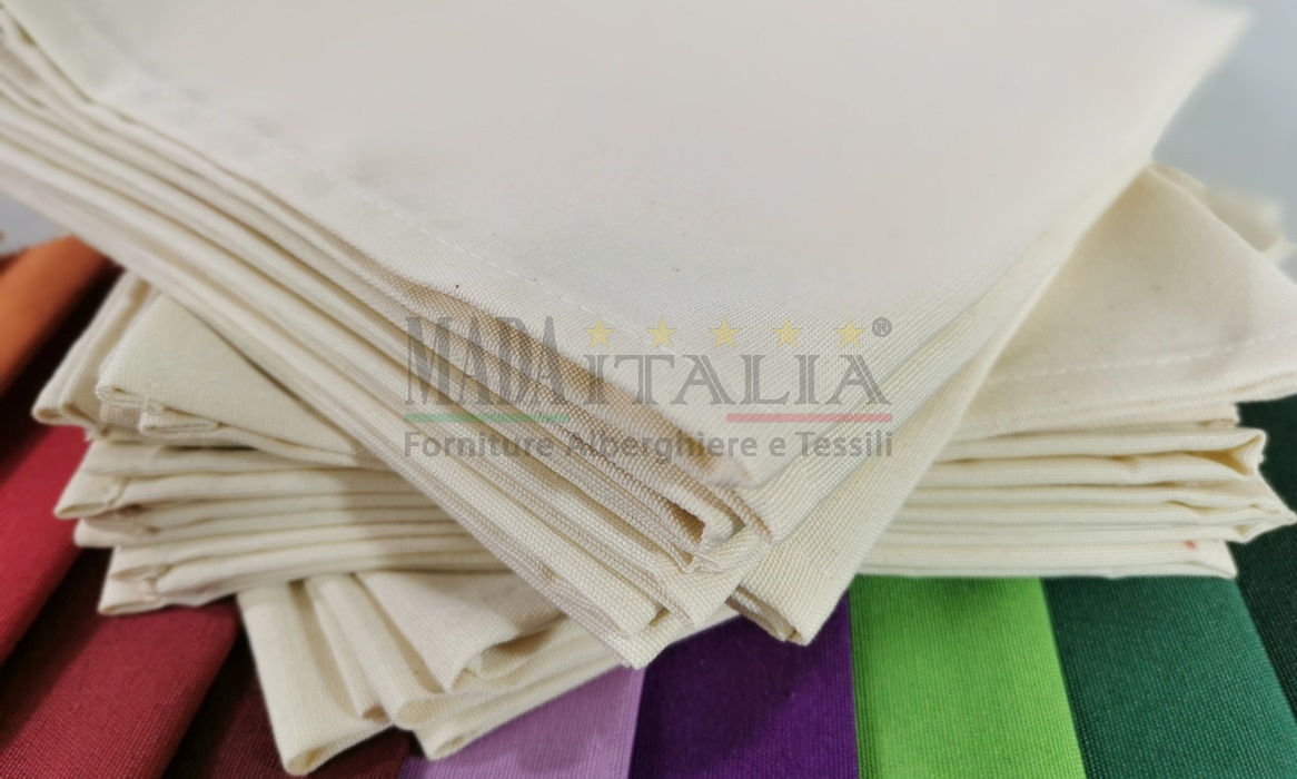 Tovaglioli per ristorante in cotone misto poliestere disponibili in 23 colorazioni. Questo tessuto è realizzato in cotone e poliestere, 2 fibre che uniscono la qualità e la facilità di lavaggio. Articolo prodotto con filati di alta qualità, eccezionale resistenza e lunga durata.